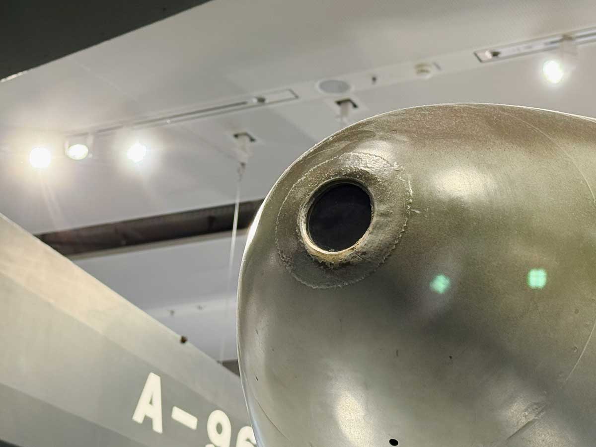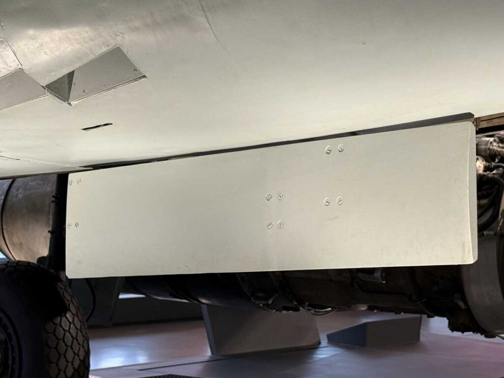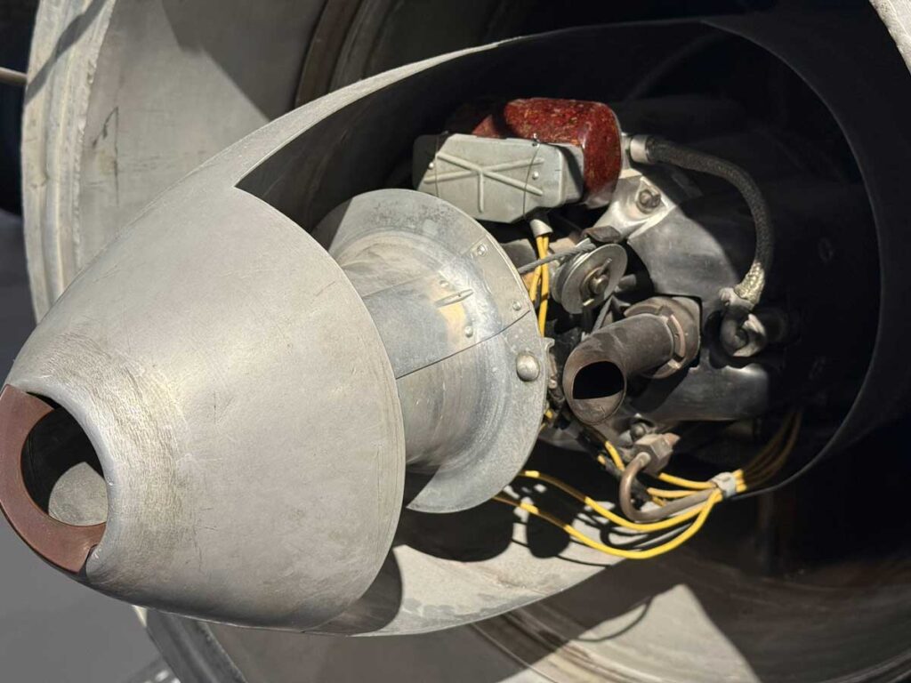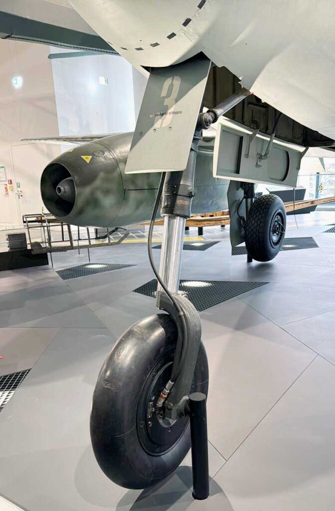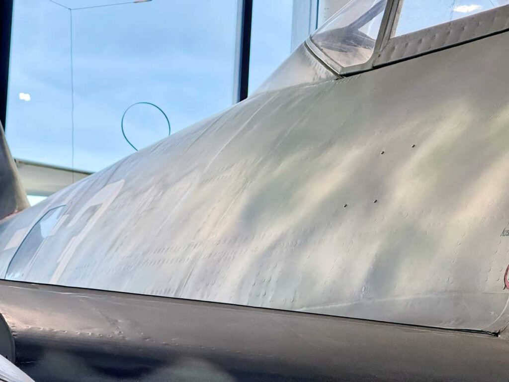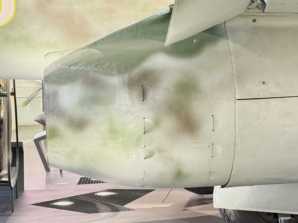 Widok Me 262 A-1a 500071 z prawej burty. Widać klapke pokrywy luku radiowego i charakterystyczne przesunięcie krzyża na niej. Zdjęcie Assizbiz.