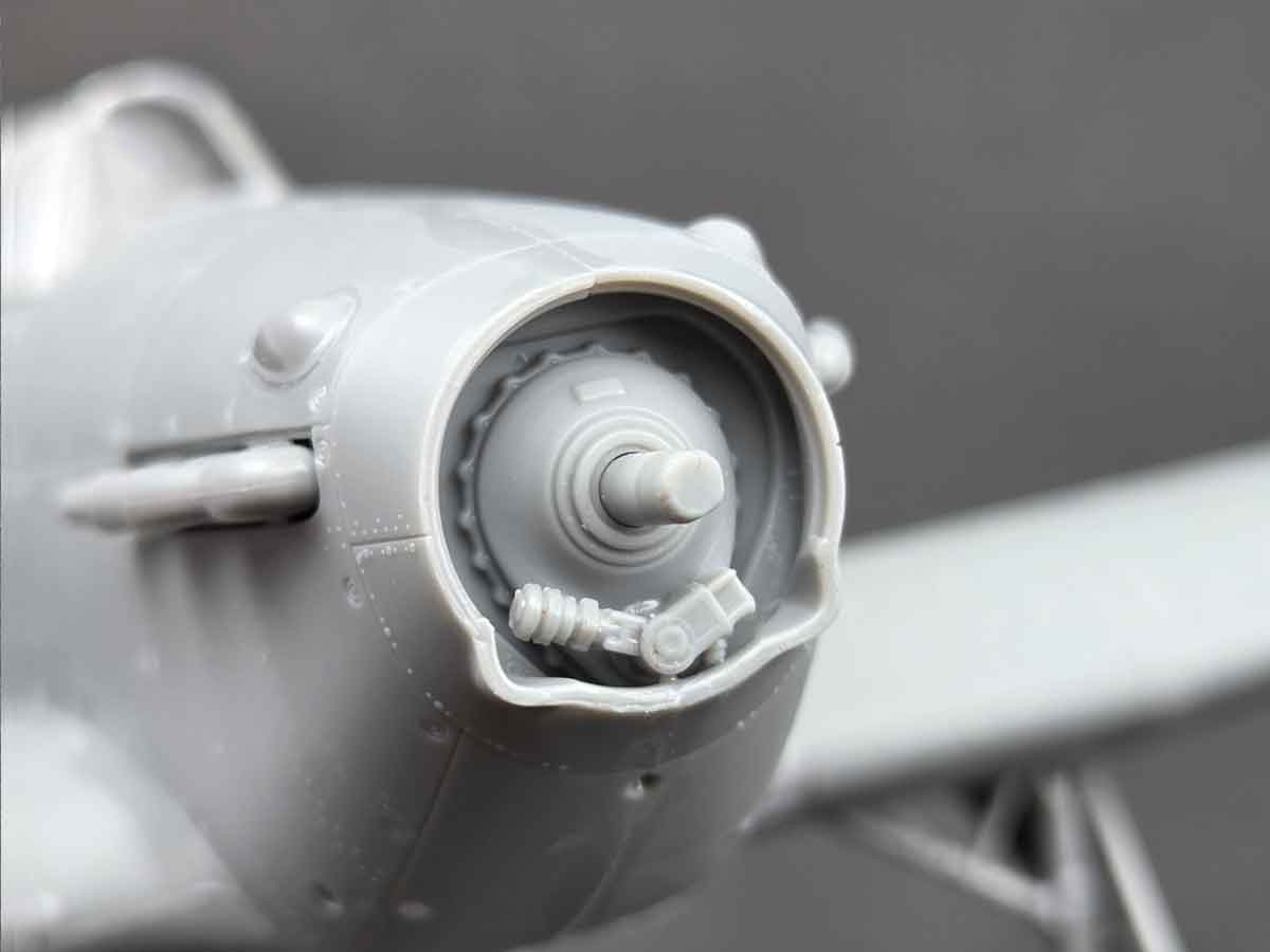 The fuselage sprue differs from the previous versions in one important feature: the front of the fuselage is open. This exposes the engine block representation, which we added for a reason. Once the propeller is installed, the engine won’t be visible, but on early Hurricanes the two characteristic side intakes reveal part of the engine — so this detail had to be included.
