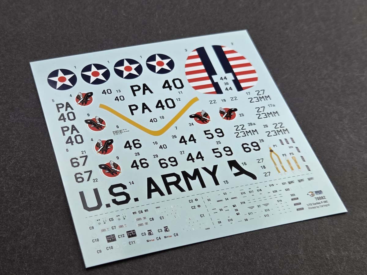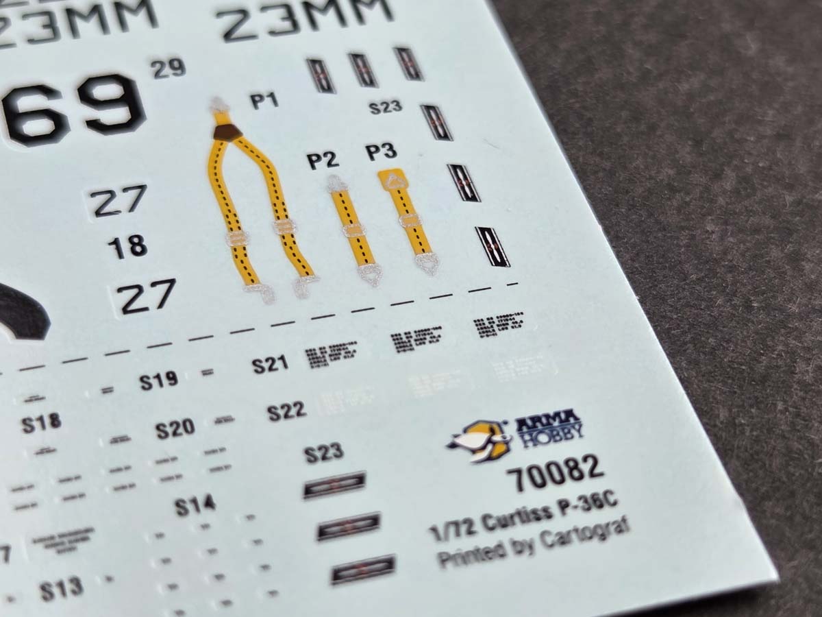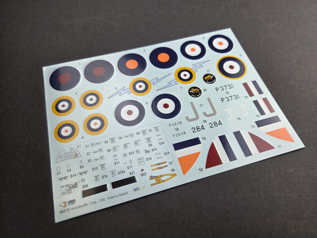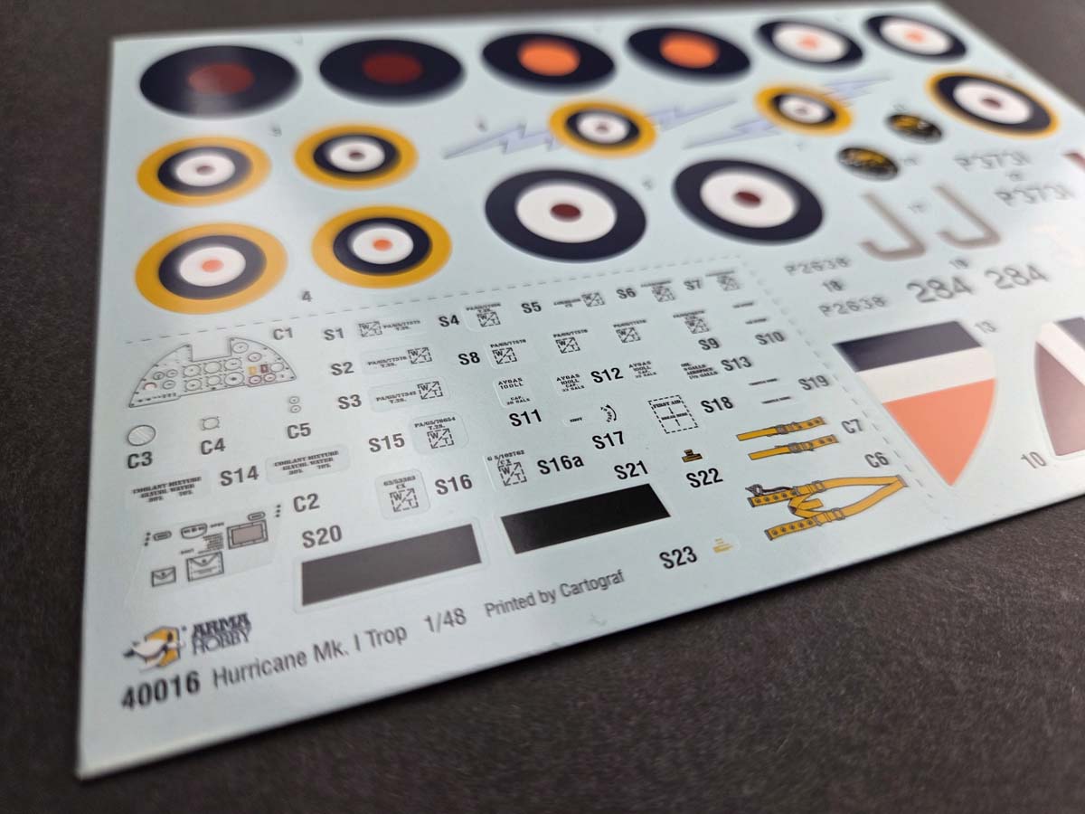 To our latest kits – Hurricane Mk I Trop 1/48 (40016) and Curtiss P-36C 1/72 (70082) – we prepared decals and masks produced by Cartograf. The decals were printed using Cartograf technology, and the masks are also cut by Cartograf.