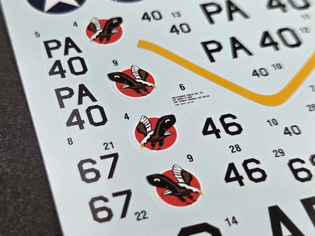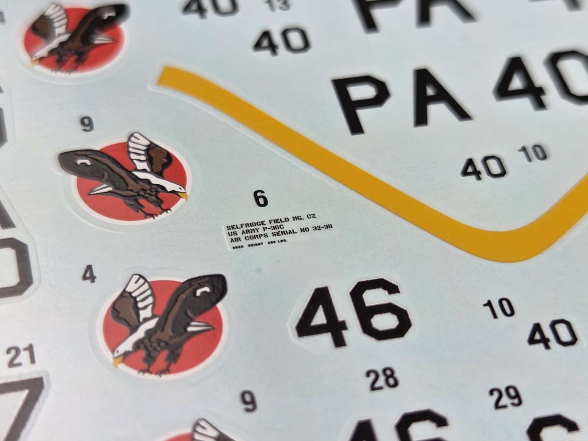 The P-36C decal sheet includes very small servicing stencils typical for aircraft of the P-36 / H-75 family. These are among the smallest elements placed on the sheet – practically at the limits of printing capability.