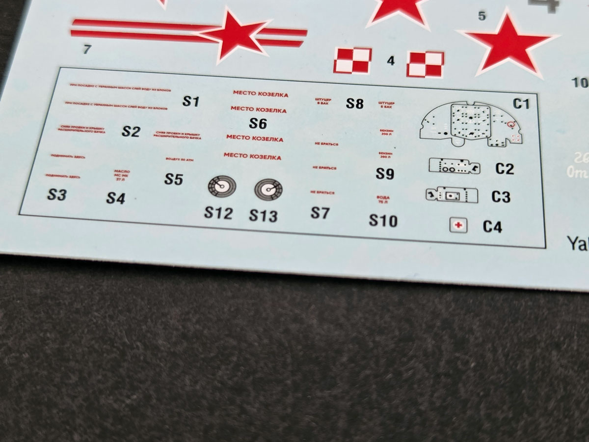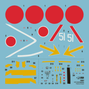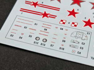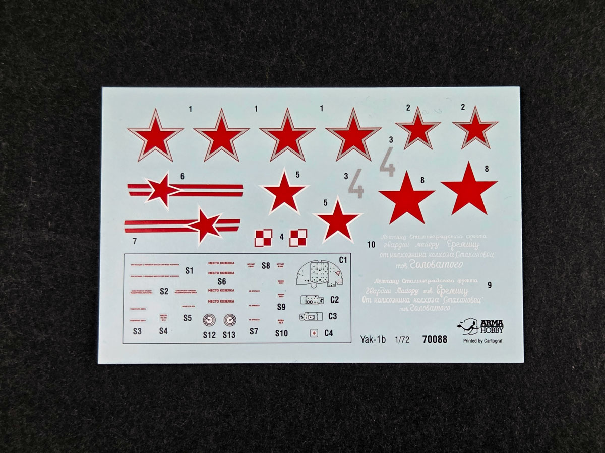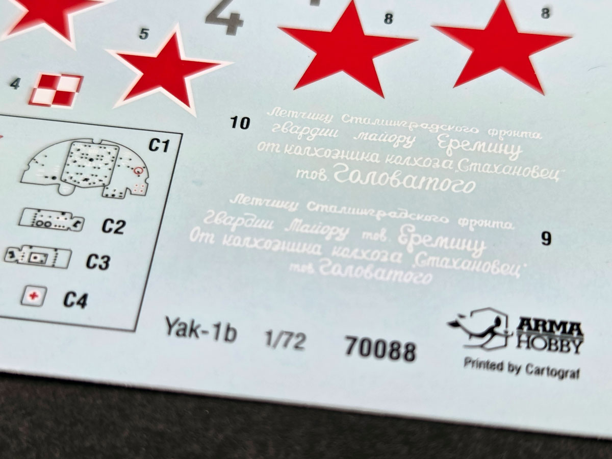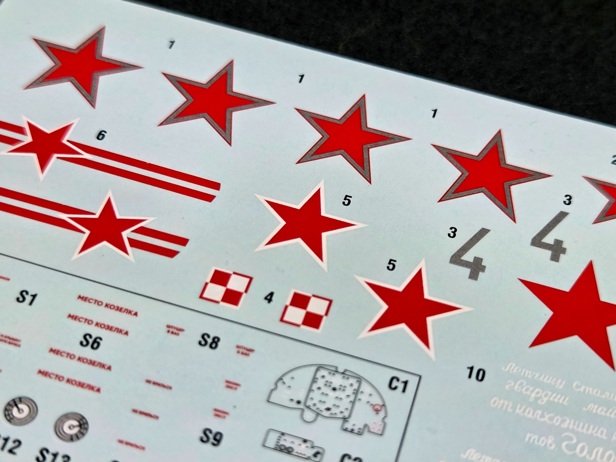 The Yak-1b, in turn, brings a classic and very striking set of Soviet markings: red stars, tactical numbers, fine stencil data, and a separate set of masks. The sheet also includes delicate decorative inscriptions, which are always one of the most satisfying details when judging print quality up close.