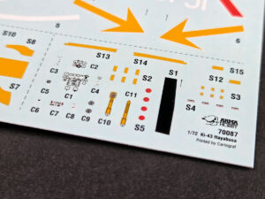 In the case of the Ki-43 Hayabusa, you can already see the distinctive Japanese national markings, yellow identification stripes, fine stencil data, and the mask sheet for the canopy and wheels. This is one of those kits where well-designed masks really pay off during painting.